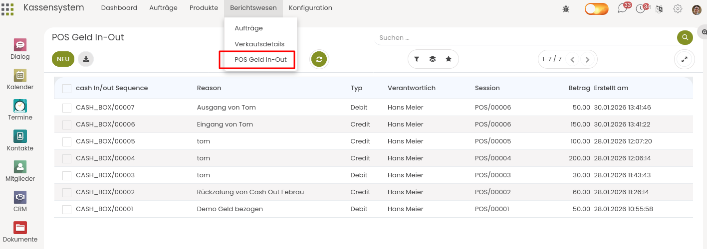 Der Bericht POS Geld-In Geld Out zeigt in der Übersicht die Ein- und Auszahlungen und sie können als Excel direkt exportiert werden.