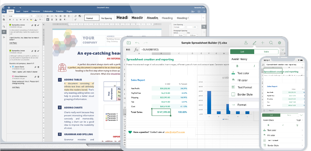Mit ONLYOFFICE können Sie in jedem Browser und auf jedem Betriebssystem online arbeiten, Dokumente offline mit den kostenlosen Desktop-Apps für Windows, Linux und MacOS (iOS) bearbeiten sowie kostenlose mobile Apps für Android und iOS nutzen.