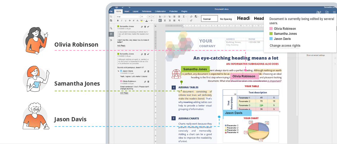 ONLYOFFICE Docs bietet Benutzern Mitbearbeitungsmodi auf Zeichen- und Absatzebene, Überprüfung und Verfolgung von Änderungen, Versionsverlauf, Kommentare und Erwähnungen, integrierten Chat sowie Plugins für Audio- und Videoanrufe. Sie können Ihre Dokumente ganz einfach mit flexiblen Berechtigungen wie Kommentieren, Überprüfen, Ausfüllen von Formularen und benutzerdefinierten Filtern freigeben.