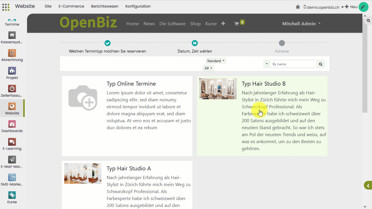 Mit der OpenBiz Terminreservation lassen sich alle Personen, Ressourcen und Dienstleistungen reservieren und planen. Der Kunde kann online über die Webseite seine Termine mit dem Verkauf reservieren oder einen Stuhl in Ihrem Coiffeursalon buchen - alles ist möglich mit dieser flexiblen Terminplanung. Für Reservationen wird auf Wunsch automatisch ein Auftrag & Rechnung angelegt und abgerechnet. Automatische Terminerinnerungen per E-Mail oder SMS stehen zur Verfügung.